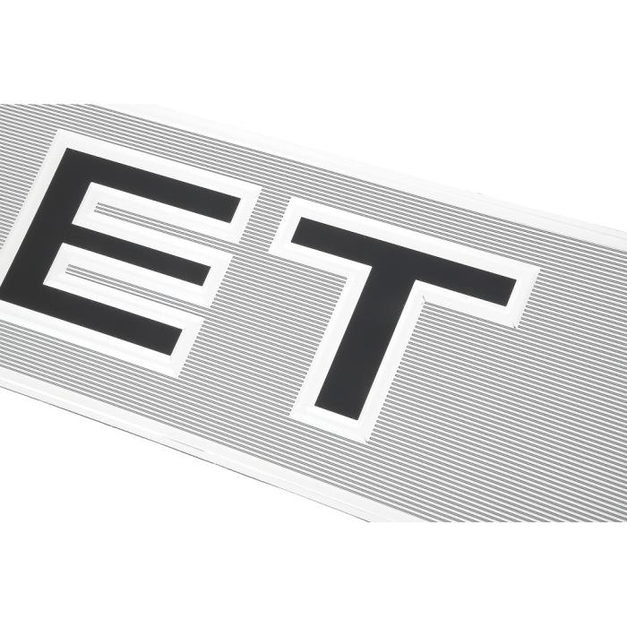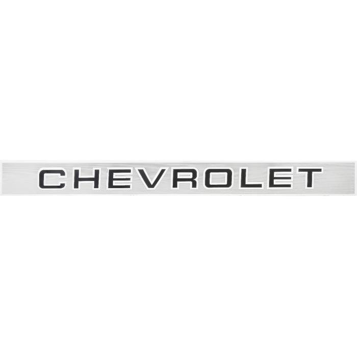 Reproduction tailgate trim panel, also known as the tailgate band, designed for 1988-1998 Chevrolet C/K (GMT400 Series) Fleetside pickup truck models. Each molding is precision-stamped in aluminum and features the correct brushed finish with black "CHEVROLET" script lettering. Installs using an adhesive peel-and-stick backing just like the factory original for easy and secure installation.