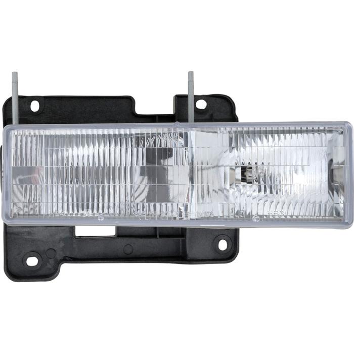 Reproduction headlamp assembly with bulb for 1988-2002 Chevrolet and GMC GMT400 Series truck and SUV models. Each headlight assembly is manufactured to factory specifications. Includes the housing, lens assembly, and bulbs for a complete replacement. For models originally equipped with a chrome grill. Fits pickup, crew cab, dually, Suburban, full size Blazer, Tahoe, fuill size Jimmy, and Yukon. For RH, passenger side.