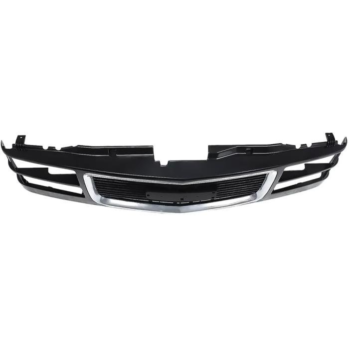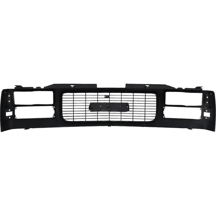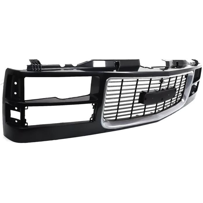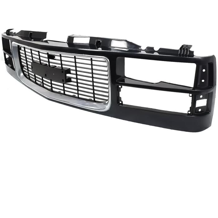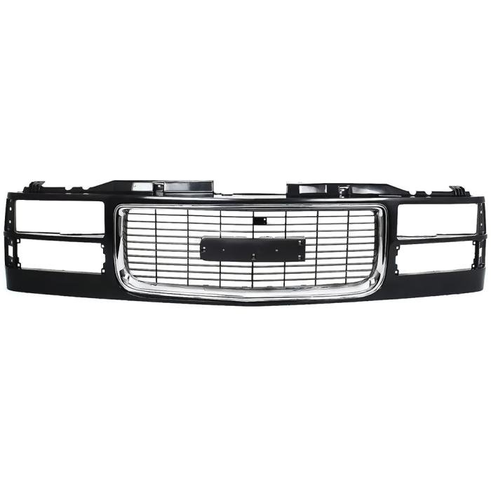 Reproduction front grill for 1994-98 GMC Pickup, 1994-99 Yukon and Suburban models with dual composite headlamps. This grill will replace the original exactly and features a chrome plated grill opening inset. Comes in black with chrome accent. Paint to desired exterior color. Note: Not for use with Sierra models after 1999 body-style change.