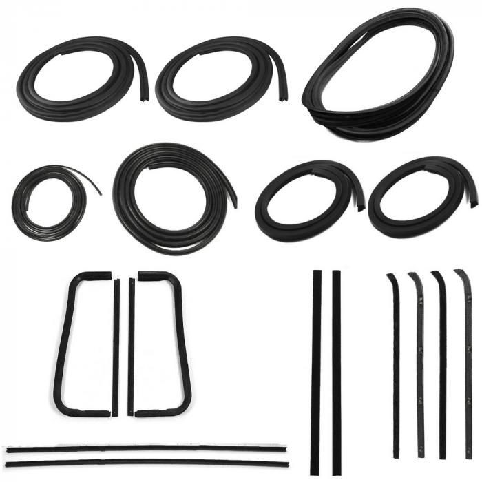 Complete weatherstrip seal kit designed for vehicles equipped with a weatherstrip trim groove and metal-framed door glass. These push-on door seals provide a reliable barrier against water, wind, dust and road noise while protecting door jambs and window frames from corrosion and wear. Engineered for durable, flexible rubber performance, the kit simplifies restoration and replacement projects by offering exact-fit profiles that compress and seal without adhesives. Ideal for restoring factory fit and finish, enhancing cabin comfort, and extending the life of metal-framed door glass assemblies.