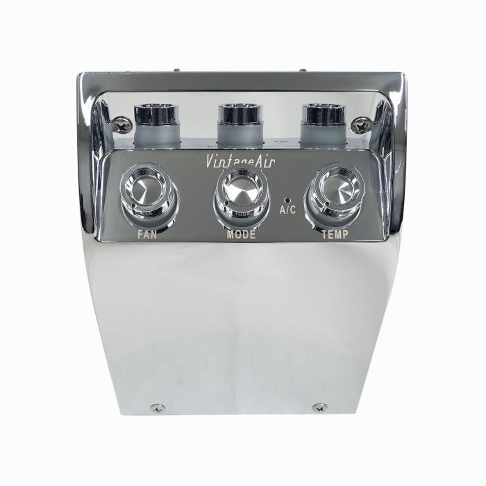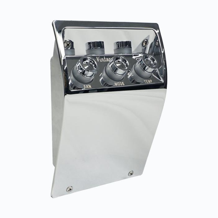 Bolt-in replacement control panel designed for 1957 Chevy passenger car Gen IV or Gen 5 SureFit systems. Features include LED panel illumination, blue "A/C on" indicator and variable adjustments for fan speed, temperature, and air delivery selection. Machined from 6061-T6 billet aluminum, then triple-chrome plated with laser etched lettering. Includes hardware to install in OEM dash location, wiring harness and complete installation instructions.