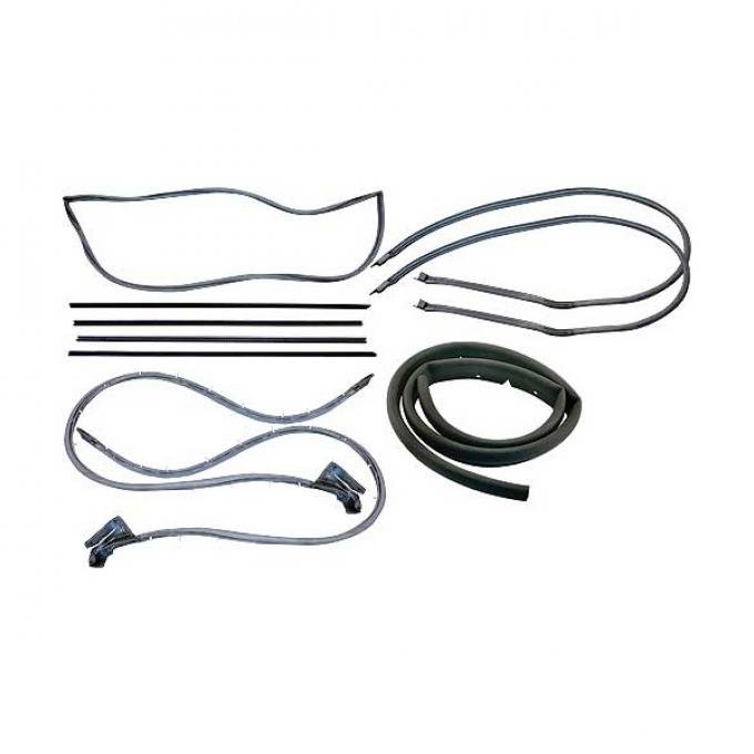 Includes rear window seal, hood to cowl seal, door seals, belt weatherstrip kit and roof rail seals. Vent bar channel glass runs and insert, vent window seals and window channel run not included.